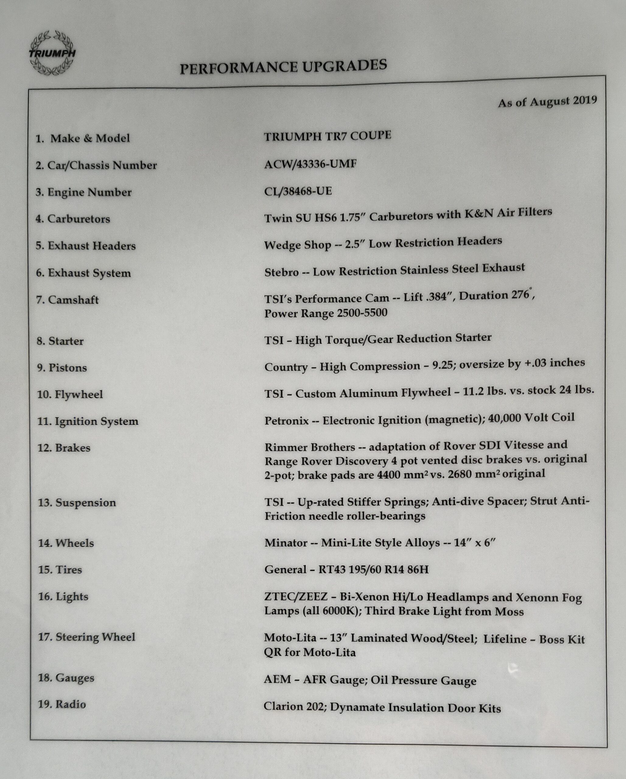 I bought her in 1979 but it’s time to let my baby go. Lots of upgrades, it drives better now than when new. See the pic listing the performance upgrades in all major systems – high compression engine and mild performance cam; big brakes; improved handling; etc. etc. Maintenance and restoration records for past 16 years available. Good looking exterior and interior, but drives even better. No problems that need addressing. Has clocked an actual 150,130 kms (note that new English odometer in the pics reads the equivalent 93,831 MILES).