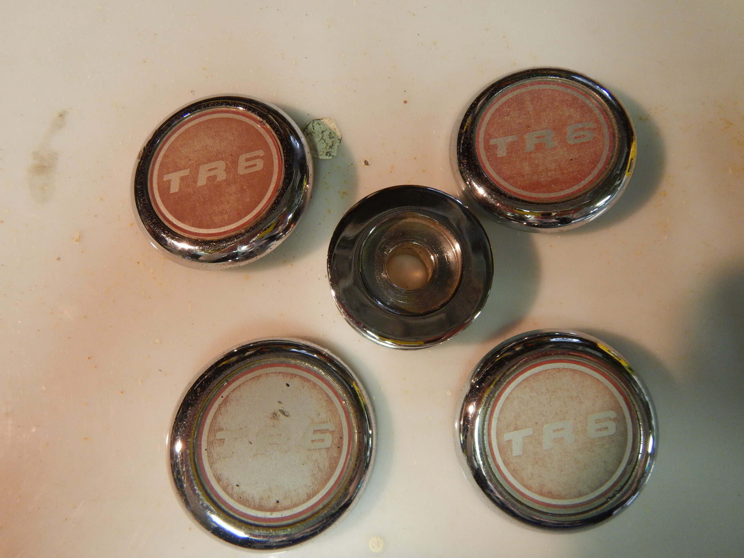 Set of 4 worn TR6 hubcaps with good screws – $15